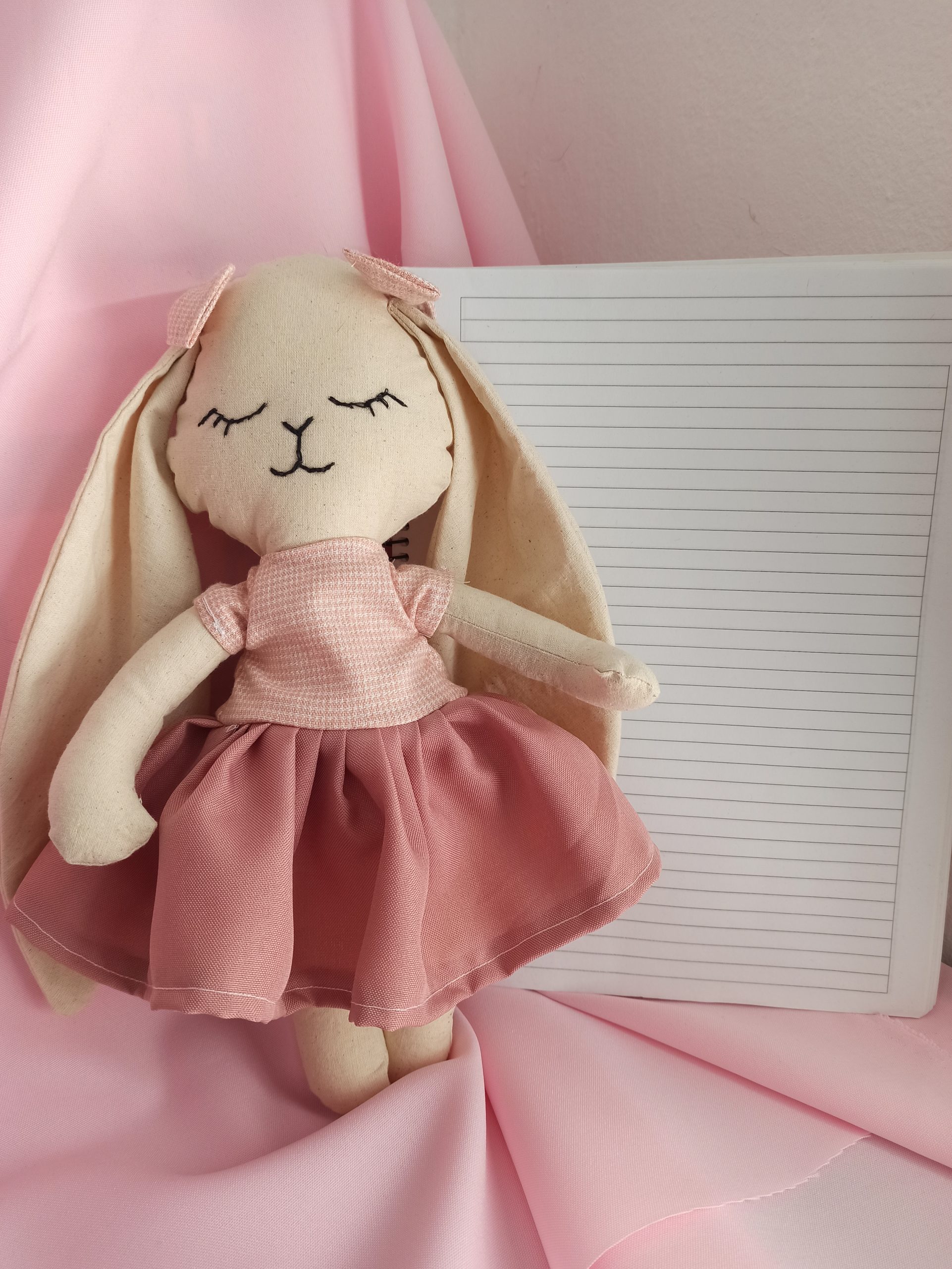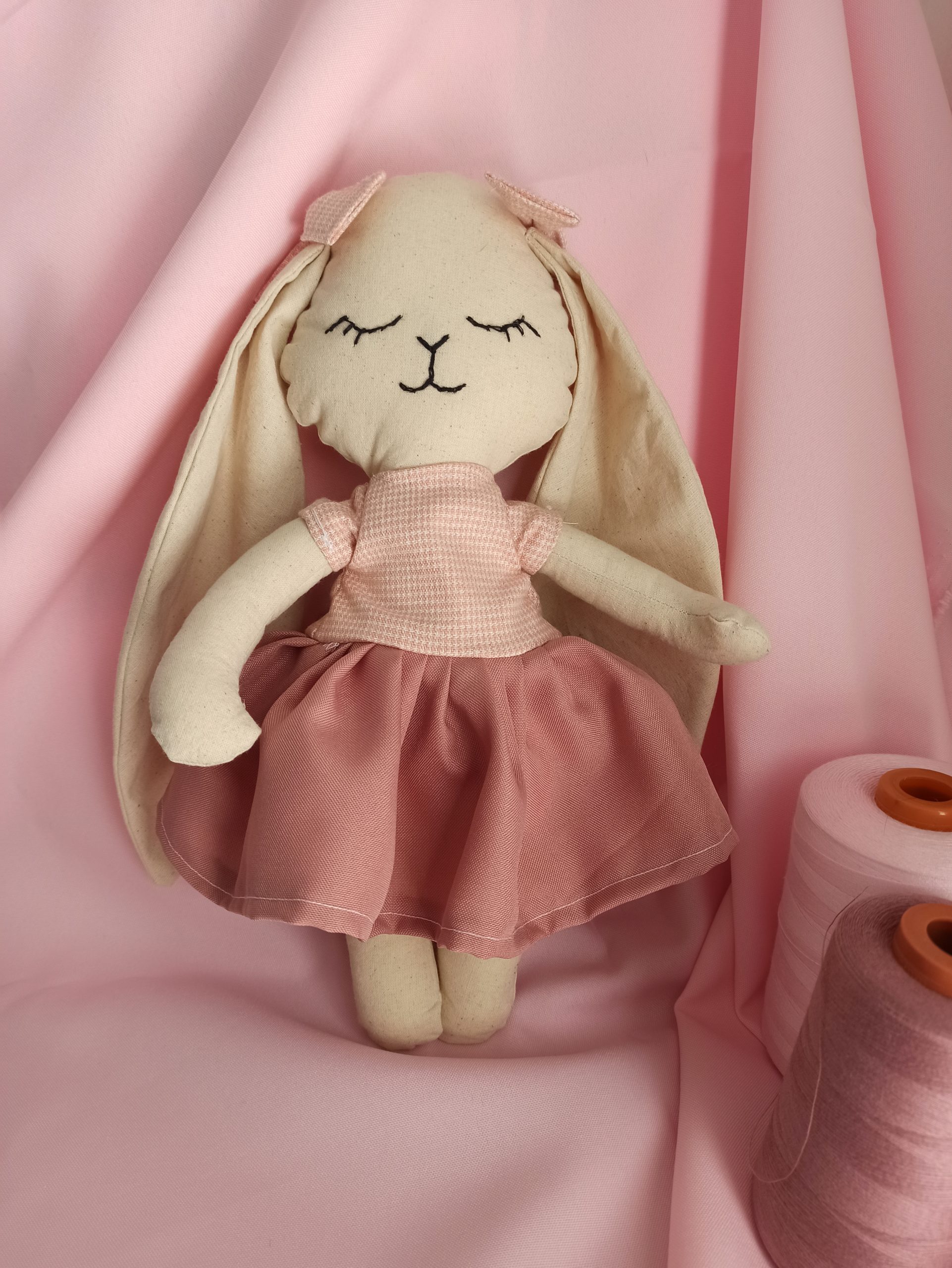 Conejita confeccionada en lienzo y relleno de fibra siliconada, totalmente artesanal. Sin botones ni partes que puedan desprenderse, todo cosido.